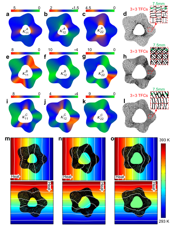 针对以上难题,研究团队提出了一种稳健可打印的自由形状热超构材料拓扑优化设计方法(图1),采用拓扑优化设计具有指定导热系数的拓扑功能单胞,组装生成热超构材料,开展了自由形状热超构材料拓扑优化设计-热超构器件增材制造-热学仿真与实验性能测试。研究团队按照上述思路,设计了具有自由形状的热集中、热旋转和热隐身等三类热超构材料构型,并开展了数值仿真(图2)和热学实验(图3)性能测试,结果表明无论热流从何种方向通过三种热超构材料,其内部各自呈现出良好的热集中、热旋转和热隐身效果。