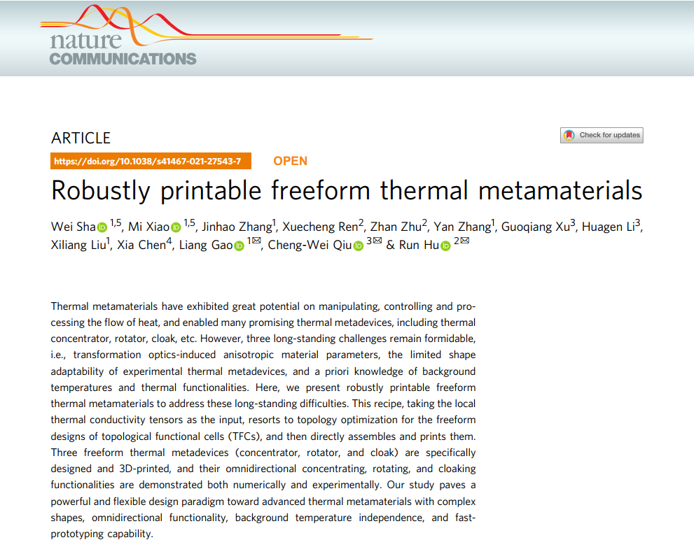 12月10日,《自然·通讯》(Nature Communications)在线刊发了机械公司高亮教授团队与新加坡国立大学仇成伟教授、能源公司胡润副教授关于热超构材料拓扑优化设计的最新研究成果“Robustlyprintable freeform thermal metamaterials(稳健可打印的自由形状热超构材料)”。机械公司博士生沙伟、副教授肖蜜为论文共同第一作者,高亮教授、仇成伟教授、胡润副教授为论文共同通讯作者,华中科技大学数字制造装备与技术国家重点实验室为论文第一完成单位。