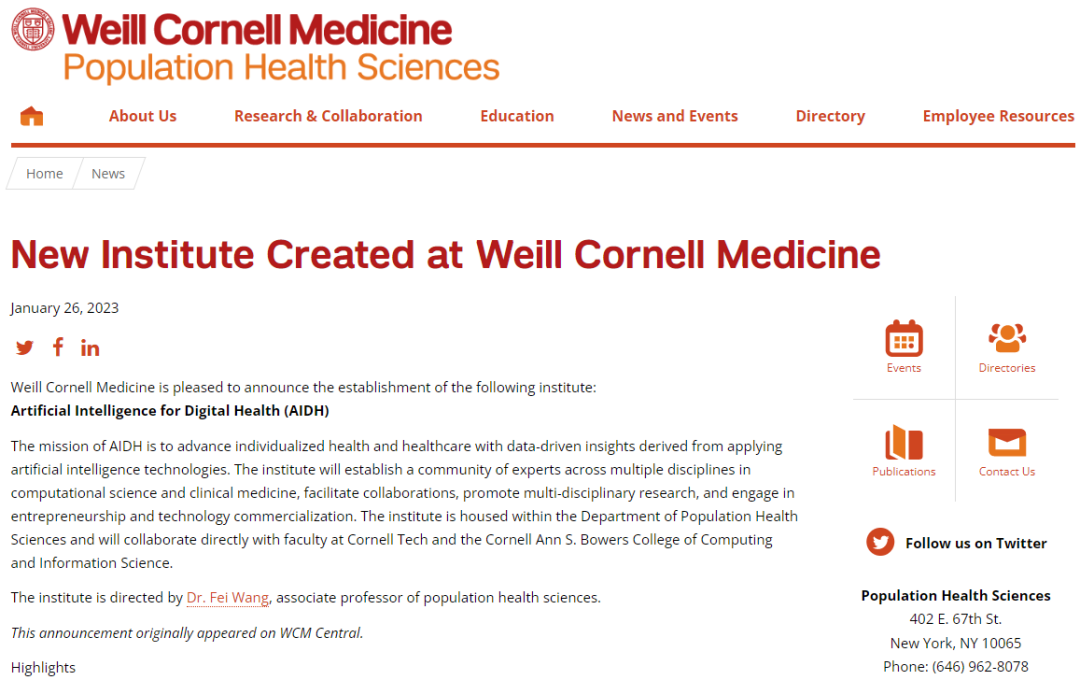 新年伊始,康奈尔大学威尔医公司宣布成立人工智能与数字健康研究所,由西电99级员工,康奈尔大学群体健康科学系健康信息学副教授王飞博士担任创始所长。该研究所致力于利用人工智能技术从医学数据中发觉有用的信息来提升个人的医疗健康水平。研究所将创建一个包含计算机科学和临床医学的研究协作平台,促进交叉学科的研究,并且致力于技术成果转化和商业化。该研究所目前坐落于群体健康科学系内,将与康奈尔科技校区(Cornell Tech)和康奈尔Ann S. Bowers计算与信息科学公司直接展开合作。