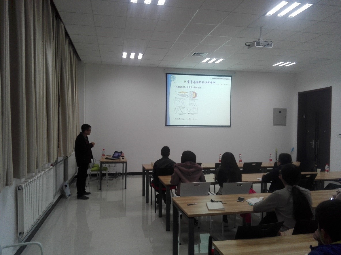 报告针对当前可穿戴/便携式电子产品的研究热点——“能量转换与储存器件”的研究进展进行了详细的介绍,报告深入浅出、内容异彩纷呈。随着现代科学技术的发展,电子产品逐渐向小巧、可穿戴、可折叠和柔性方向发展,这就要求为电子产品提供能量转换与储存的器件具有轻、薄、柔等特点。基于此发展需求,开展了太阳能电池和超级电容器关键材料的设计及其应用研究,并探索其在柔性可穿戴的能量转换与存储器件方面的应用。例如在能量转换材料与器件方面,为了降低传统的PN结硅电池的制备成本,尝试使用有机导电聚合物替代P型硅,并通过电池材料微纳结构的设计,以及背钝化层引入,调控其光电性能,实现了硅基有机/无机杂化太阳能电池转换效率的提高和成本的降低。报告内容引起了与会师生的浓厚兴趣,并踊跃提问,彭教授对提出的问题作了详细解答。