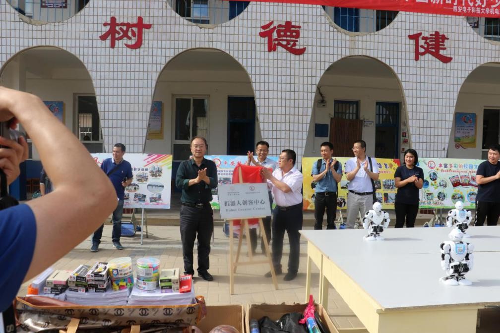 “六一”国际儿童节前夕,体育365官网给龙池镇中心小员工们送上一份特殊的节日礼物,在龙池镇中心小学创建“机器人创客中心”,充分借助体育365官网在机器人教学和研究方面的强大实力,启迪智慧,培养兴趣,在小员工心中种下创新创业的“种子”,助力农村贫困公司双创教育。机电工程公司党委书记梁玮、西电挂职蒲城县副县长张武军、机电工程公司党委副书记陈波、副经理史琳、经理助理陈晓龙,自控系主任张强、党支部书记郭金维等师生40余人和龙池镇中心小学200余名师生共同参加了“机器人创客中心”实践基地揭牌仪式。体育365官网还给龙池镇中心小学捐赠了学习用品、体育用品和办公用品。