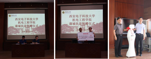 在蒲城扶贫捐赠仪式上,公司党委书记梁玮代表公司向蒲城捐助15万元,分别用于教育、产业扶贫,执行经理黄进代表公司向尧山中学捐赠了机电·小暄智能机器人并为同学们作《信息时代的机电工程》科普报告,同学们认真聆听并踊跃提问,展现了尧山中学学子对科学探索的浓烈兴趣。蒲城县副县长张武军对公司的扶贫工作给予了高度的赞扬和肯定,他寄语同学们刻苦学习、抓住机遇,预祝他们在马上到来的高考中取得好成绩,并希望同学们常怀感恩之心,常立报国之志,好好学习,为蒲城的更好发展贡献力量。