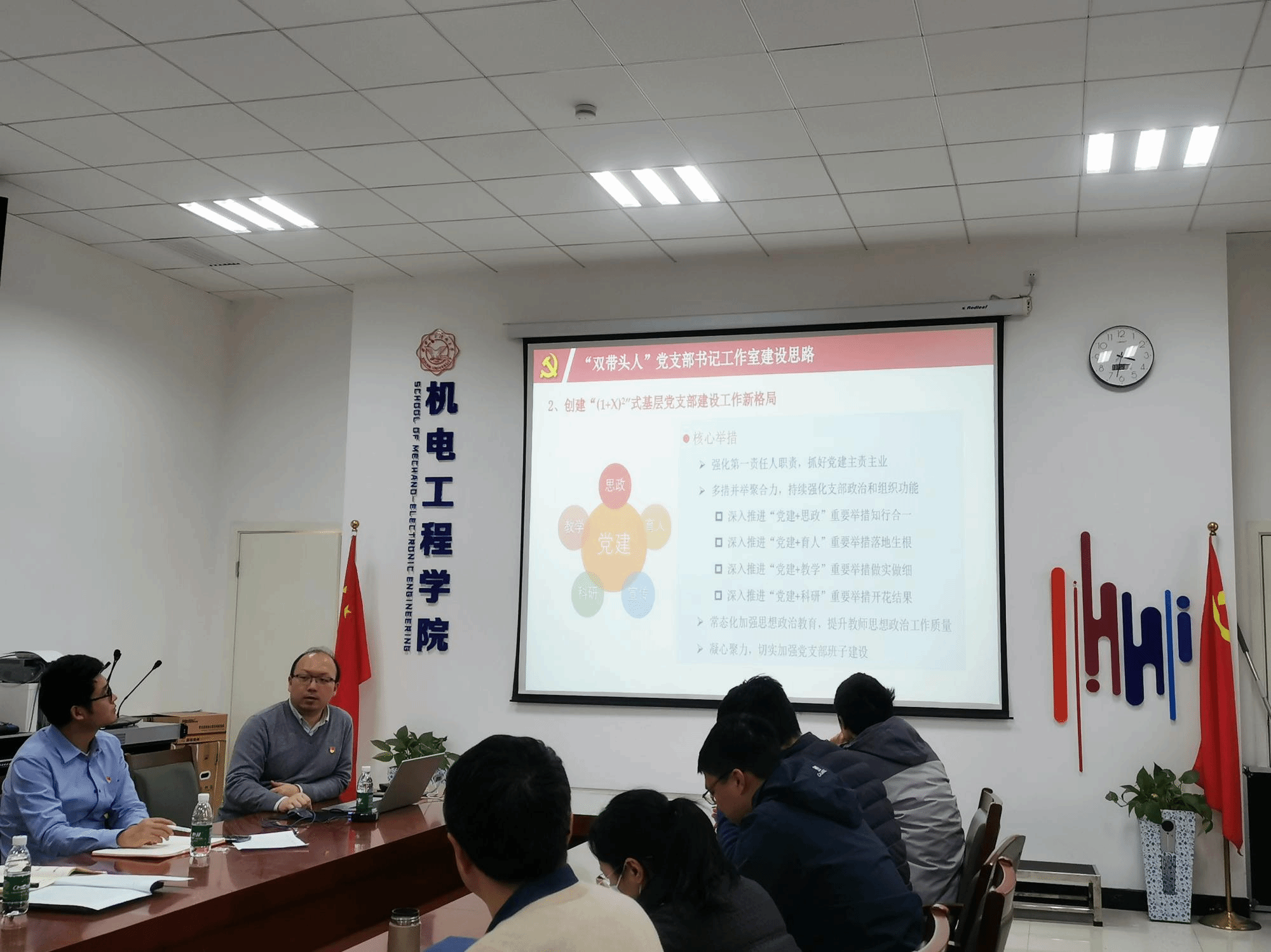 随后,王靖宇教授介绍了西北工业大学航天公司的党建工作理念,着重探讨了在公司推动“双一流”建设的新形势下,研究所党支部所面临的一系列新困难以及探索出的一整套培养“双带头人”、“(1+X)^2”式基层党支部的工作经验,从建设格局、阵地建设、业务融合创新机制以及具体实施举措等四个方面介绍了开展基层党建工作的核心措施,分享了西北工业大学无人系统制导与控制研究所党支部“1234N”本研全周期党建育人新模式和“矩阵式”党建业务融合创新机制,并介绍了校院企业支部共建等多方面工作的开展情况和下一步工作举措。