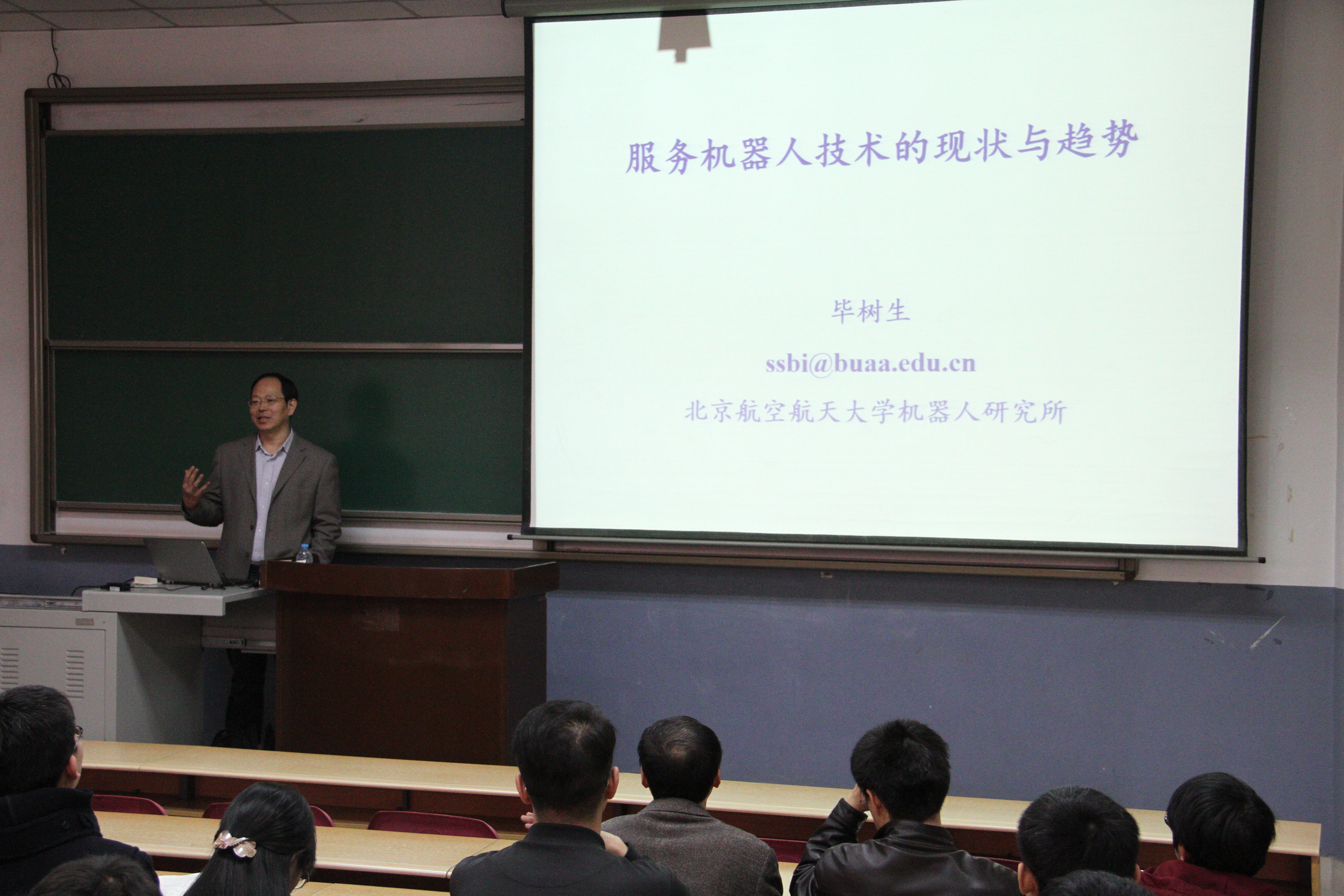 (通讯员 葛持恒)3月5日,应体育365官网智能制造与机器人技术工程研究中心陈贵敏教授邀请,北京航空航天大学机器人研究所毕树生教授来公司访问交流。5日下午,毕树生教授在阶梯教室J-204做了题为《服务机器人技术的现状与趋势》的学术报告,报告会由体育365官网副经理黄进教授主持,公司教师及研究生150余人到场聆听报告。