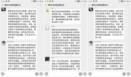 最后支部书记蔡一凡同志总结并谈论自己的想法:人人安全,国家有责;国家安全,人人有责。在维护国家安全上,人人都不是局外人、旁观者,而是人人有责,更需人人尽责。现在,疫情还没有结束,“内防反弹、外防输入”的任务仍然很重,还需要上下齐心,同舟共济。作为研究生党员我们更要正确把握当前国家安全形势,提升国家安全意识,自觉维护国家安全,为实现“两个一百年”奋斗目标、实现中华民族伟大复兴的中国梦提供牢靠安全保障。
