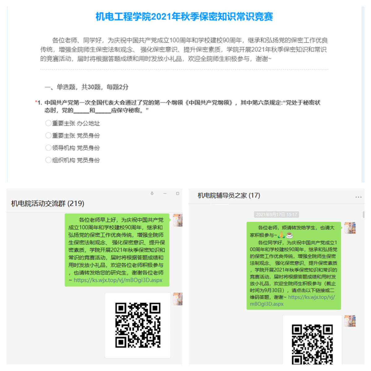 (通讯员:石贵利)为庆祝中国共产党成立100周年和公司建校90周年,继承和弘扬党的保密工作优良传统,同时激发全院师生保密知识学习兴趣,增强保密意识,营造和谐保密文化氛围,体育365官网于9月中下旬开展了2021年秋季保密知识和常识竞赛答题活动,通过微信群、公司电子屏等多种方式动员全院教师和研究生积极参与。