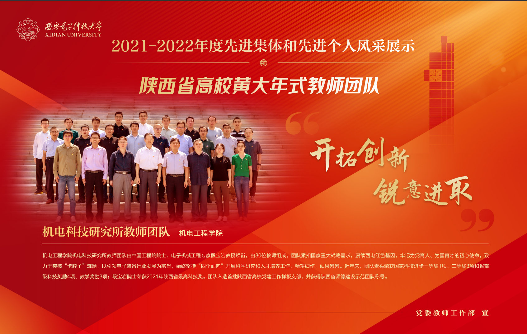 体育365官网机电科技研究所团队由中国工程院院士、电子机械工程专家段宝岩教授领衔,由30位教师组成。团队紧扣国家重大战略需求,赓续西电红色基因,牢记为党育人、为国育才的初心使命,致力于突破“卡脖子”难题,以引领电子装备行业发展为宗旨,始终坚持“四个面向”开展科学研究和人才培养工作,精耕细作,硕果累累。